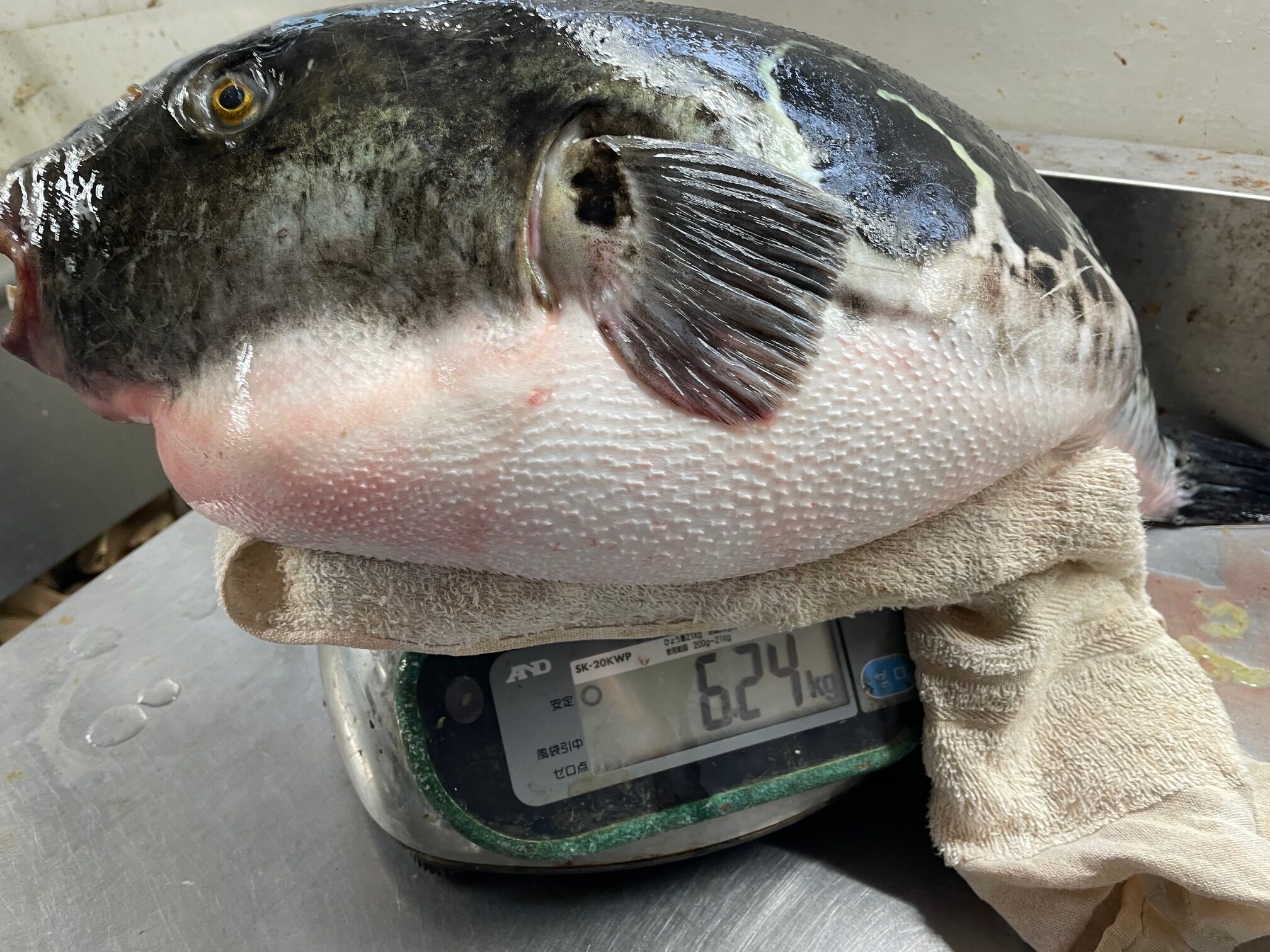 幸丸乗船の前橋からの樋口さん、3,4キロの大型のトラフグを持参、捌いて手渡し。