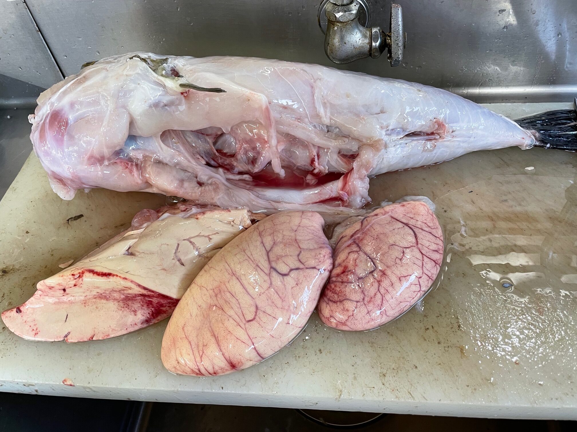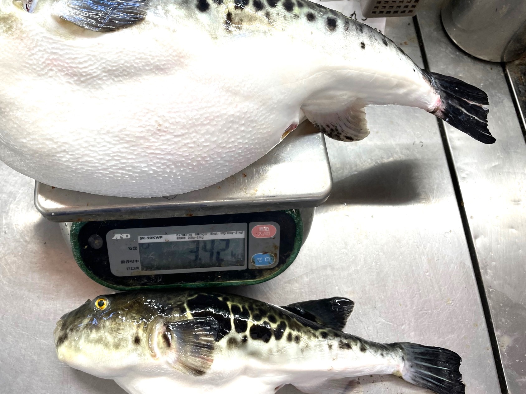 12 4月 by watanabe 鹿島港宗和丸に乗船の長谷川さん、トラフグ2匹捌き! 4月11日茨城の鹿島港宗和丸に乗船した長谷川さんからふぐの捌き依頼を受けました。一時間かけて到着し3,42キロと1,8キロの2匹を認証施設で捌く。 お腹を開いて見るとしらこと呼ばれる精巣では無くまこと呼ばれる卵巣でした。